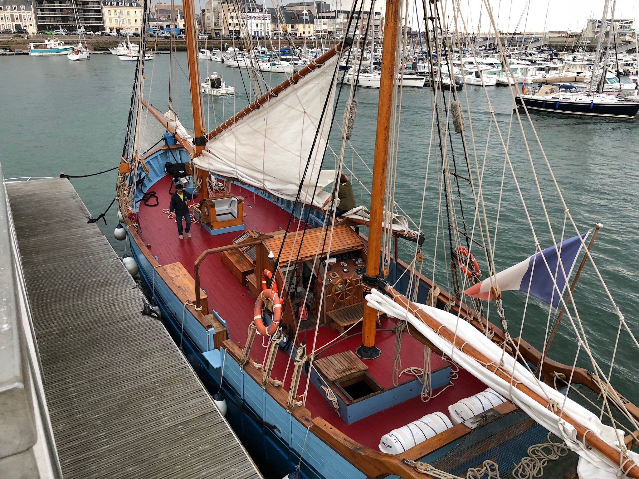 Idag lämnar vi Bretagne och går till Normandie och Fécamp, 82 nm. Sol men kall vind hela vägen. Vinden ökar när vi närmar oss hamnen, regin och åska på väg. Vi ringer alltid till hamnen innan vi går d...